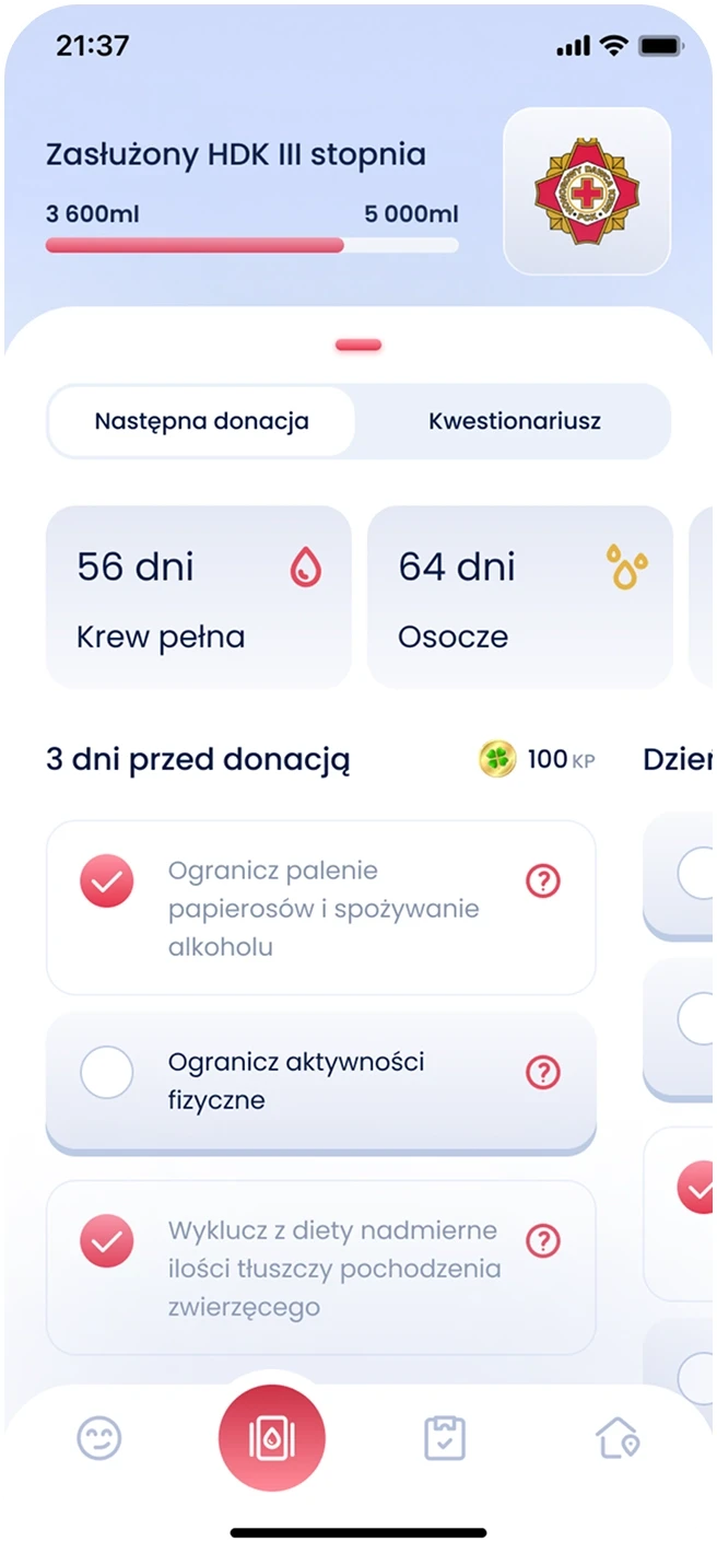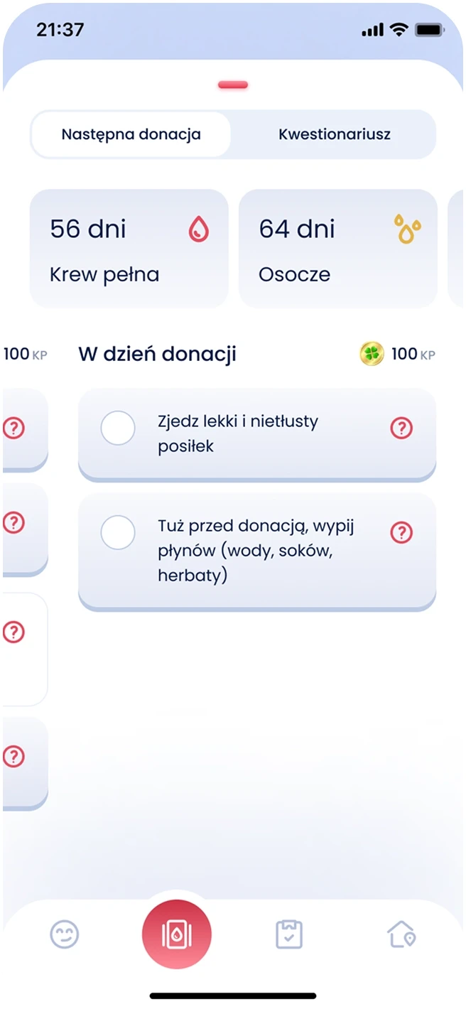 ...and earn “Karma Points” by donating, preparing properly, or completing educational quizzes, and spend them on digital rewards like accessories for their Krwinka or physical items picked up at donation centers. This playful layer helped transform a medical task into something that felt personal, rewarding, and even fun.