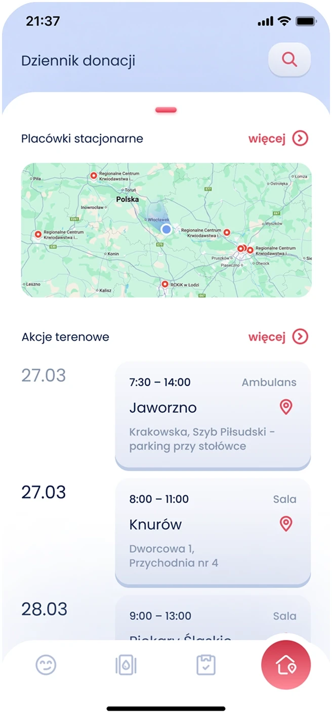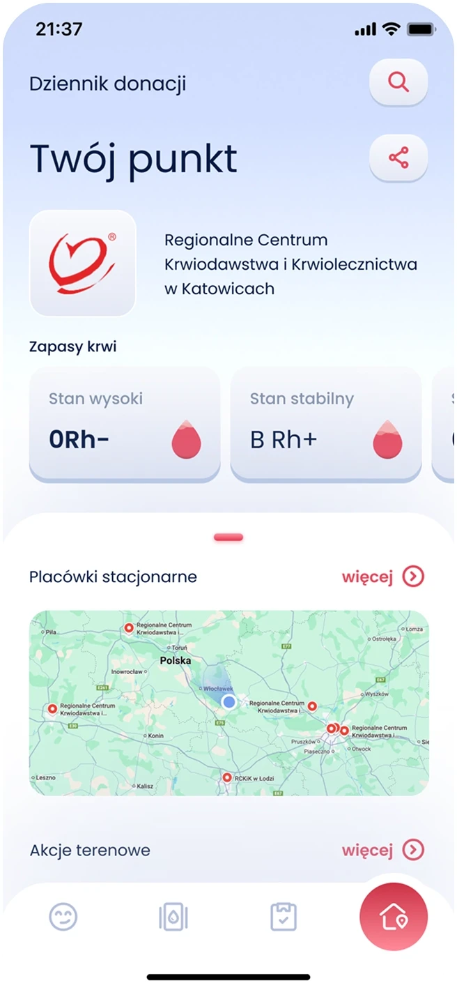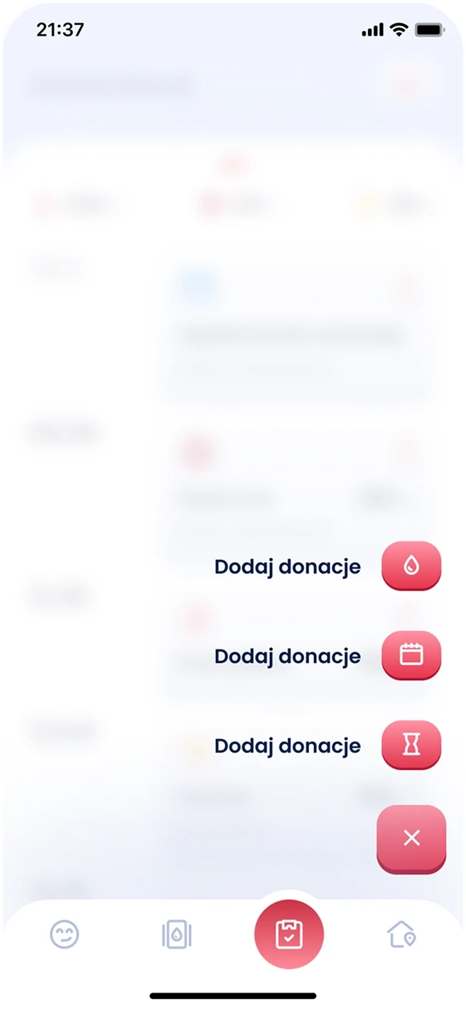 I designed a mobile application aimed at supporting and motivating blood donors in Poland. The goal was to tackle the challenge of irregular blood donations by making the process more engaging, educational, and convenient. I led the project from start to finish, using a user-centered design approach guided by the Double Diamond process. Every decision - from discovery to visual design - was based on real user needs and behaviors.