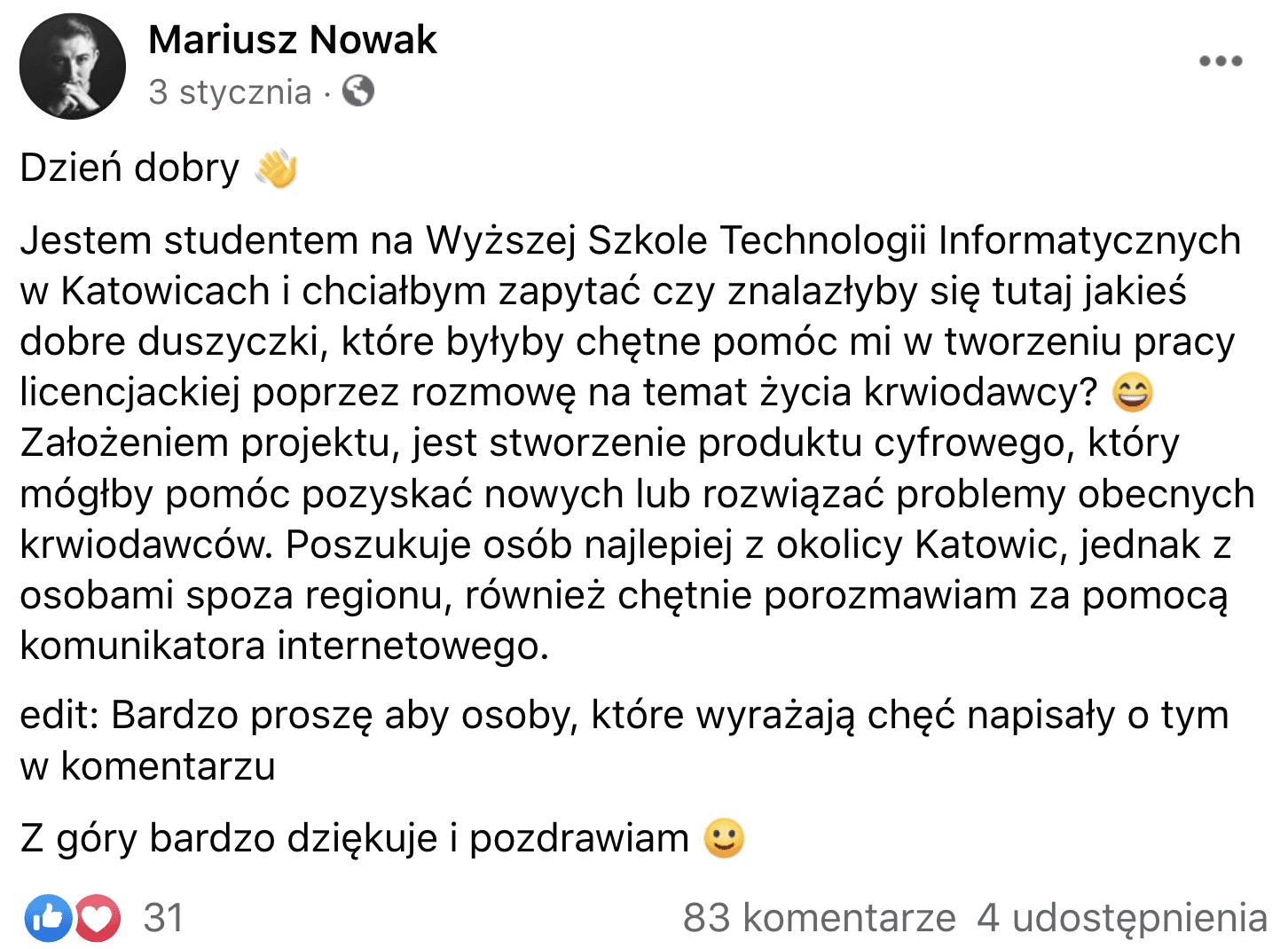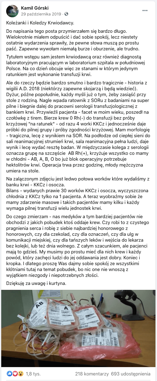 A post by Mr. Kamil, dated October 30, 2019, on the “Honorary Blood Donors” Facebook group” that inspired me to create the project